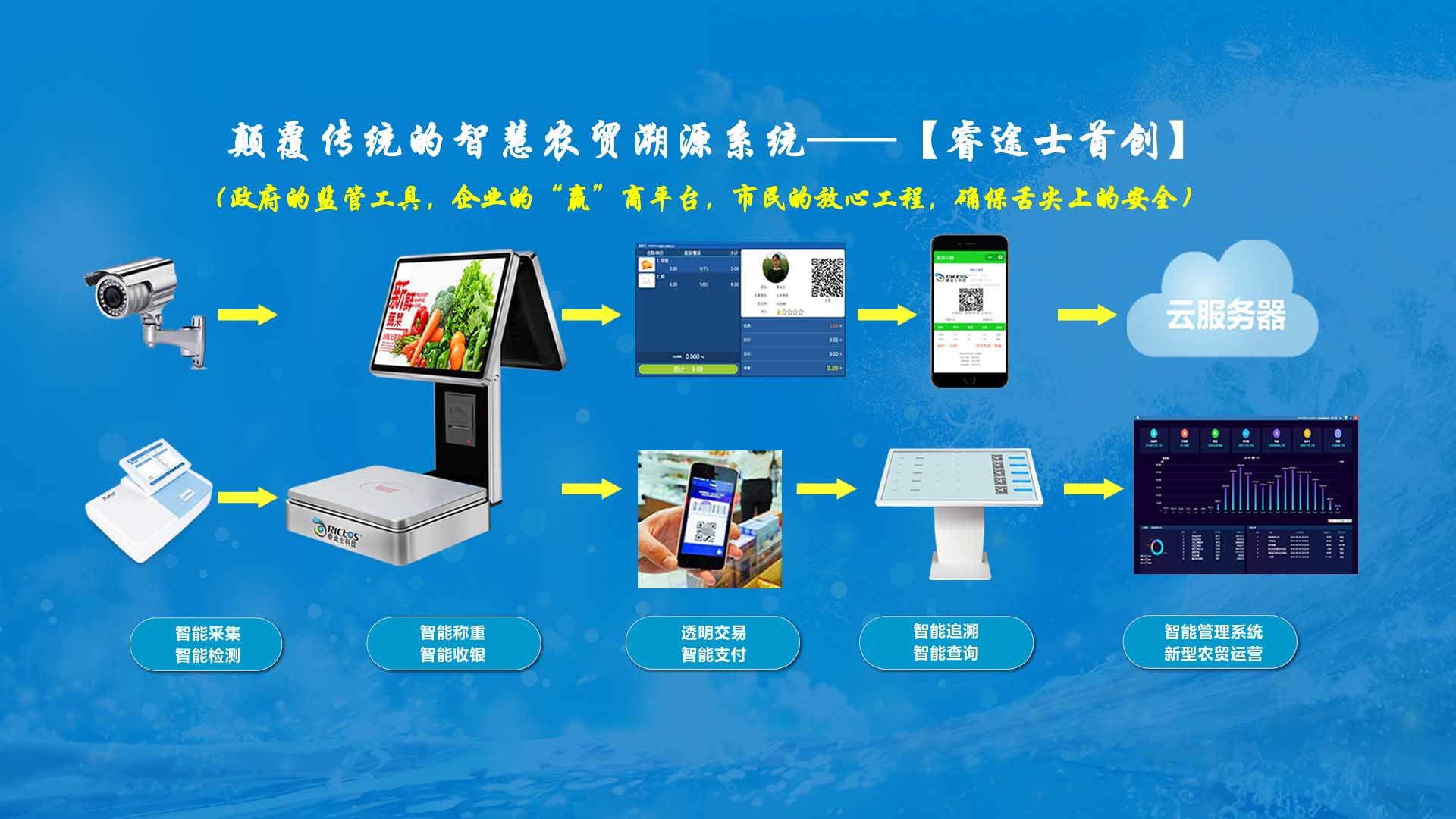 創(chuàng)新實(shí)現(xiàn)了【智慧農(nóng)貿(mào)溯源管理系統(tǒng)】與【智能稱重收銀】一體化解決方案,集市場管理、運(yùn)營管理、溯源追溯、智能收銀大數(shù)據(jù)運(yùn)用于一體,硬件、軟件與管理系統(tǒng)完美結(jié)合。適用于農(nóng)批、農(nóng)貿(mào)市場蔬菜、生鮮、水果、水產(chǎn)、肉類、熟食等稱重和非稱重銷售;由于采用一體化設(shè)計(jì),解決了傳統(tǒng)農(nóng)貿(mào)市場無法實(shí)現(xiàn)的信息化、智能化、可追溯的管理問題;使稱重、收銀、追溯、管理、更透明、公正、安全,讓顧客無后顧之憂,給管理工作帶來極大的便捷與高效,對國內(nèi)農(nóng)產(chǎn)品行業(yè)的發(fā)展、農(nóng)產(chǎn)品流通管理起到了典范作用。 【睿途士首創(chuàng)】顛覆傳統(tǒng)的“智慧農(nóng)貿(mào)市場系統(tǒng)”,解決了傳統(tǒng)農(nóng)貿(mào)系統(tǒng)單一安卓掛屏,昂視不方便看、不直觀、無互動(dòng)性,傳輸信息不齊全、不穩(wěn)定的問題,也解決了按鍵電子秤商品難找、商品代碼難記、按鍵操作不靈活、支付不智能,對收銀管理、銷售商品、菜名、菜價(jià)、打折、優(yōu)惠、會(huì)員、線上下單、采購等無法實(shí)現(xiàn)實(shí)際菜品交易和追溯等問題。 更具顛覆性的是睿途士智慧系統(tǒng)擁有三大管理平臺(tái)(市場管理平臺(tái)、總部運(yùn)營管理平臺(tái)、商戶后臺(tái)管理平臺(tái))、一個(gè)可視操作前臺(tái)和三大追溯功能,讓遠(yuǎn)程管理、數(shù)據(jù)傳輸、人機(jī)互動(dòng)、智能控制、移動(dòng)支付、大數(shù)據(jù)、互聯(lián)通信、云端存儲(chǔ)、人工智能、智能城市、電子定位、智能收銀等功能得以實(shí)現(xiàn)。